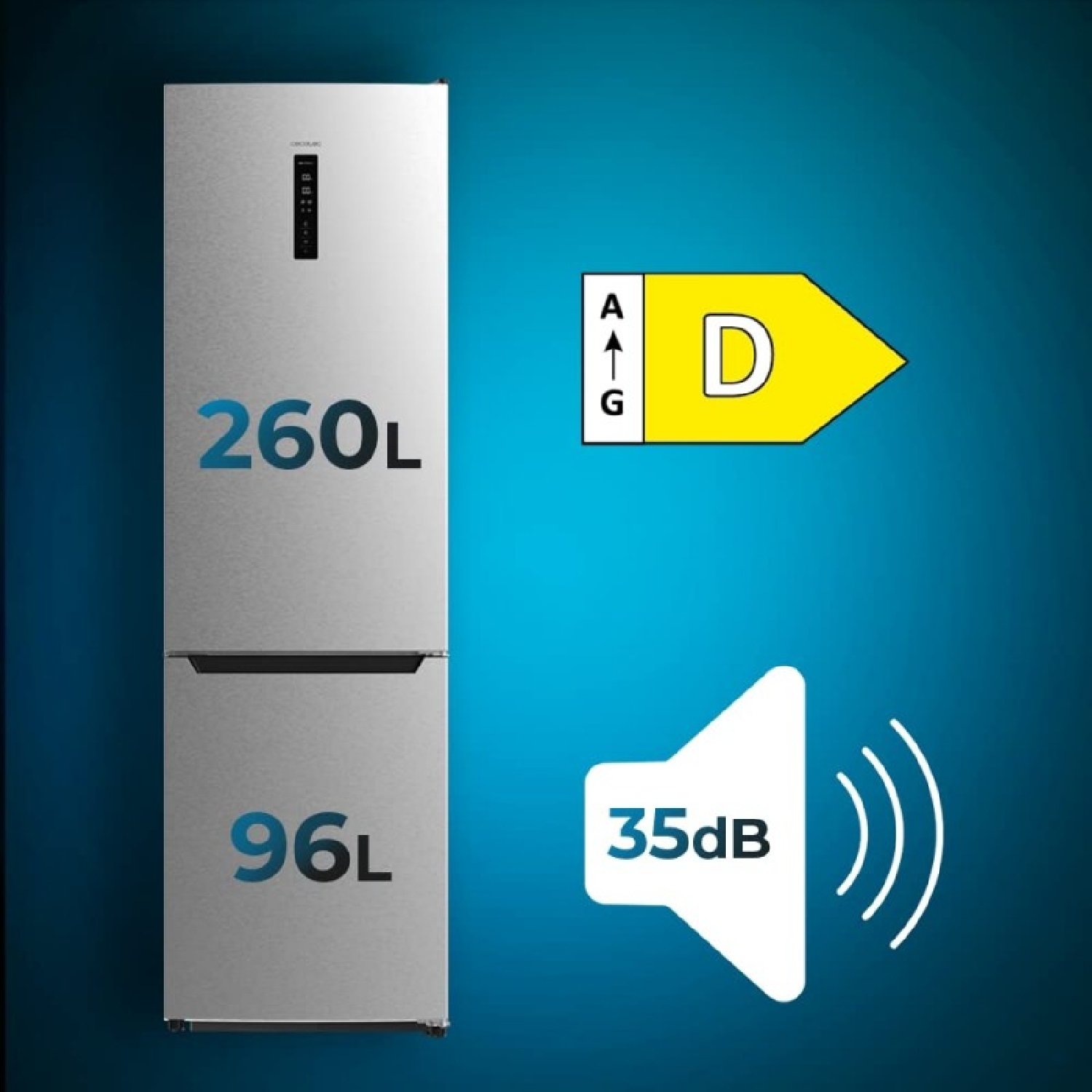 Frigorífico combi Inox con 356 litros de capacidad, 200 y 60 cm de ancho, clase D, con sistema Multi Air Flow , total No frost y 2 cajones para los productos frescos, adaptándose a todas sus necesidades.