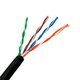 Bobina cable de red Cat. 5e UTP AWG24 rÃgido calidad garantizada para uso exterior. La capa exterior del cable está fabricada con polietileno de alta calidad y resistente a los rayos ultravioleta. Cumple las normas ANSI / TIA / EIA 568-B, 2 CAT5e, ISO / IEC 11801 (2nd Edición), CENELEC EN 50173-1, IEN 61156-5, CENELEC EN 50288-3-1, IEC 61156-6, CENELEC EN 50288-3-2. Resistencia a la propagación de las llamas según IEC 60332-1-2. Longitud de 305 metros. Color negro. Normativas: RoHS. 100% testeado.