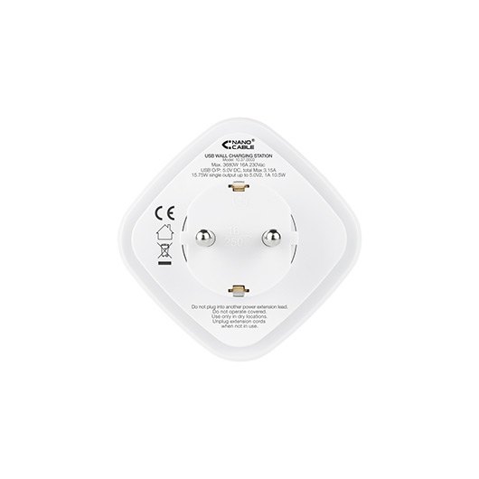 Cargador universal con 3 puertos USB y enchufe integrado. Enchufe con toma de tierra. 3 puertos USB, 2 de tipo A y 1 de tipo USB-C (Máximo 3.15A). Enrollador de cable alrededor del enchufe. Voltaje: 230V-50Hz /16ª. Certificado CE, ROSH, GS y REACH.