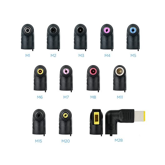 Cargador automático universal para portátiles y otros dispositivos con 12 conectores intercambiables DC. Permite cargar dispositivos MP3, teléfonos móviles, cámaras digitales, videocámaras y otros dispositivos con salida USB a través del puerto USB del cargador.