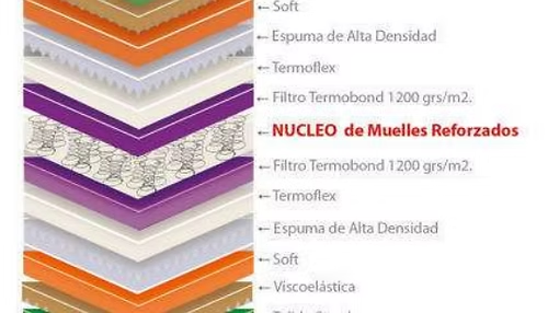 La estructura interna de este colchón de muelles ignífugo certificado cuenta con una carcasa de muelles bicónicos de alta calidad, con una densidad de 130 muelles por metro cuadrado. Para asegurar que el colchón mantenga su forma original incluso con un uso intensivo, hemos incorporado refuerzos laterales que estabilizan la superficie de descanso. Este sistema es ideal para quienes prefieren la firmeza clásica y una ventilación natural superior, evitando la acumulación de calor durante la noche.