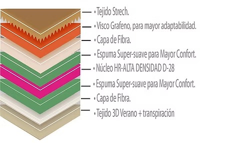 La principal ventaja del Modelo Graphene Confort reside en su núcleo de HR D-28 de firmeza media. Esta densidad proporciona la base necesaria para mantener la columna alineada, evitando hundimientos incómodos. Sin embargo, el verdadero «secreto» de su rendimiento es la integración de partículas de grafeno en sus capas de confort.