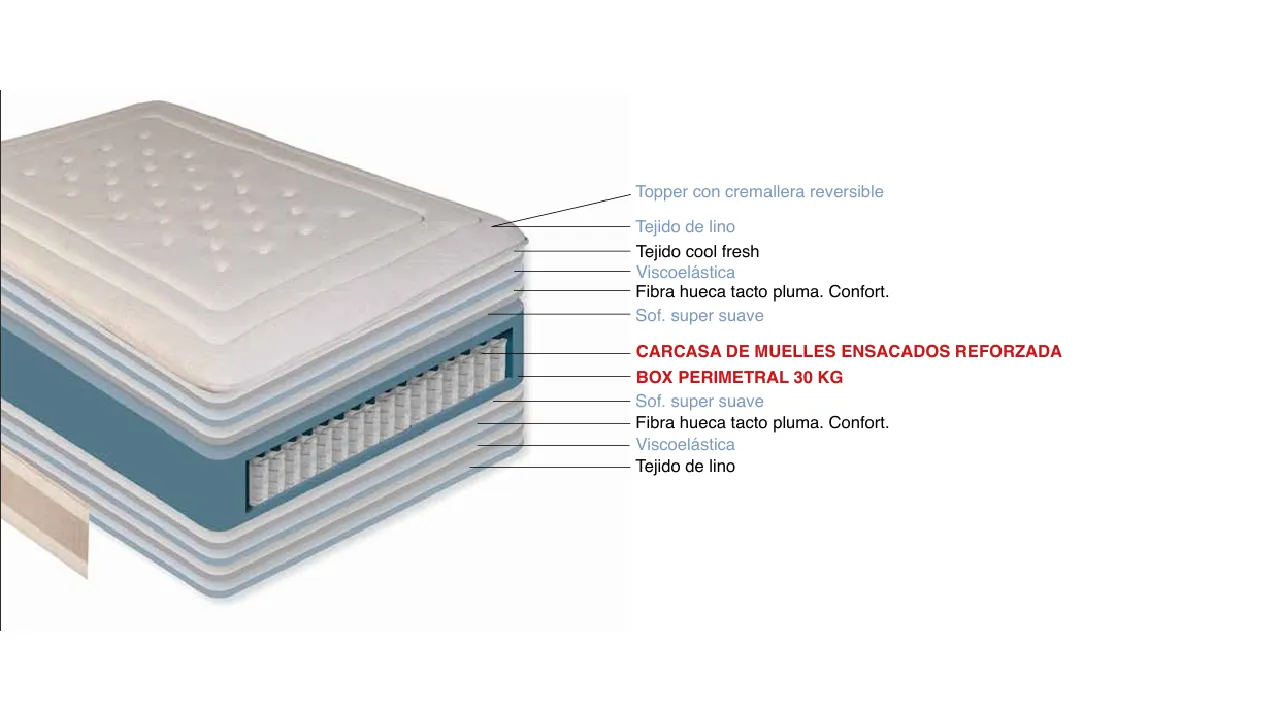 Una de las características más innovadoras de este modelo es su topper integrado y desenfundable. Este elemento permite una limpieza en seco profesional, garantizando una higiene máxima y prolongando la vida útil del producto. El topper añade una capa extra de adaptabilidad, permitiendo que el cuerpo descanse sobre una superficie mullida y acogedora que reduce significativamente los puntos de presión.