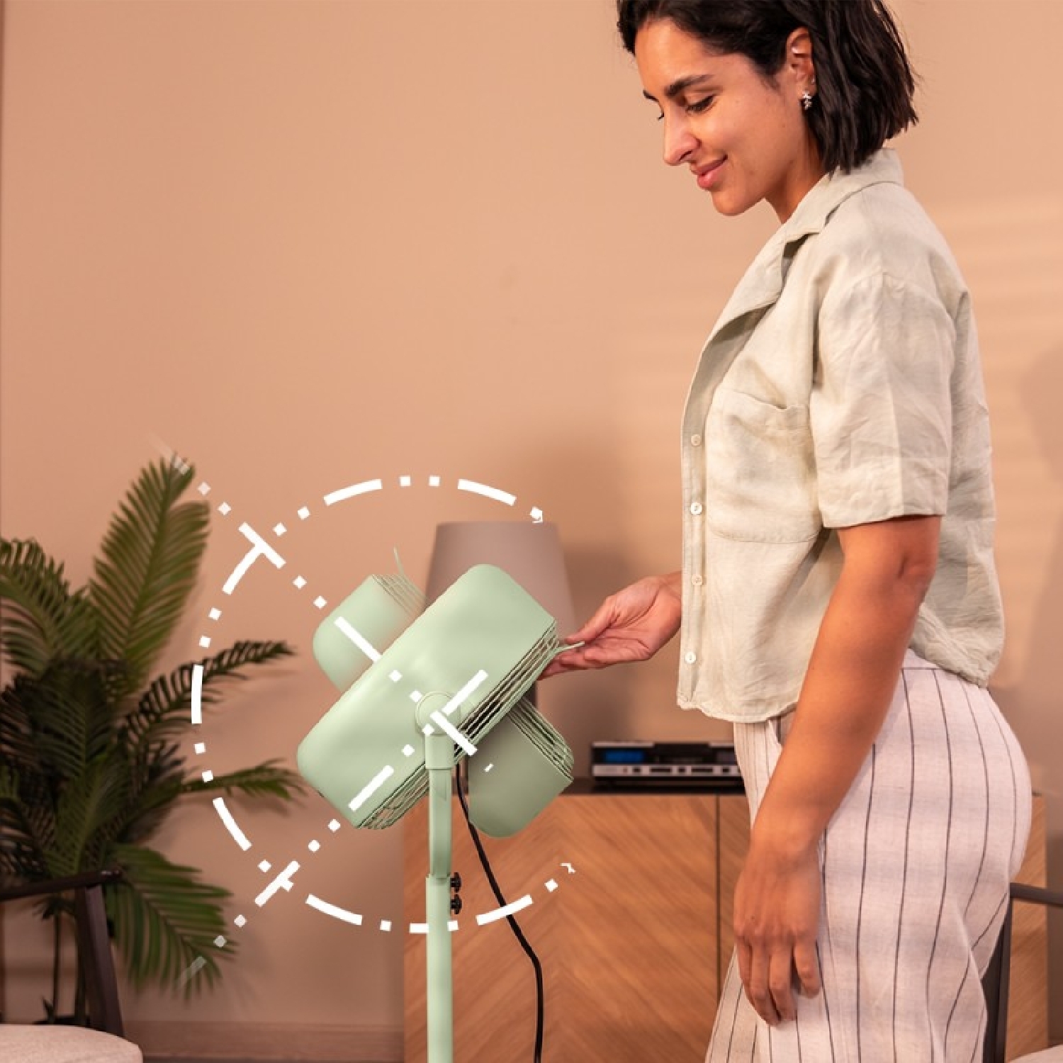 Ventilador de pie estilo retro color verde de 10″ con 25 W e inclinación ajustable.