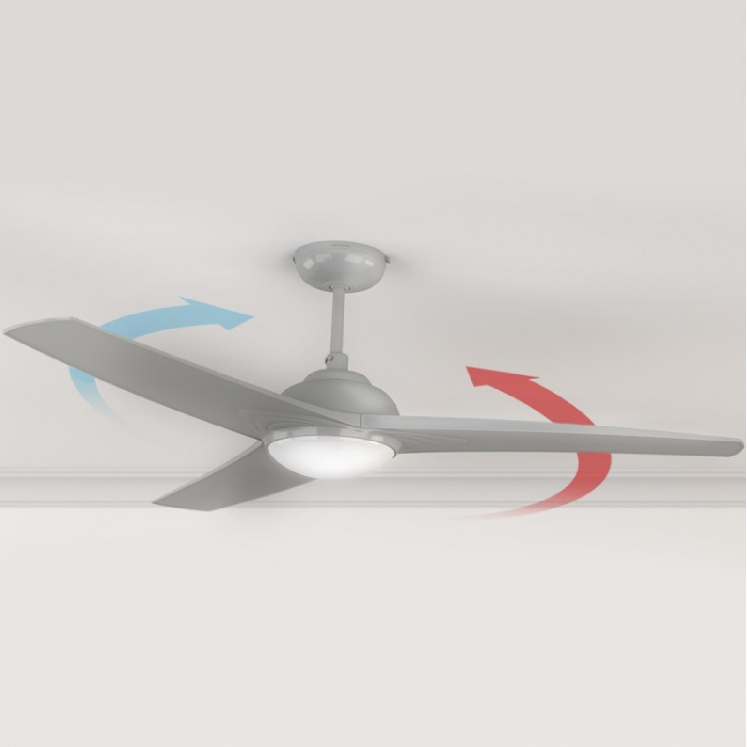 El ventilador dispone de un sistema de inversión de giro del motor para realizar la función verano/invierno. Mediante un conmutador se selecciona el sentido de rotación de las aspas, en un sentido en verano para generar una agradable brisa y en sentido contrario en invierno para impulsar el aire caliente concentrado en el techo hacia el suelo, perfecto para complementar tu sistema de calefacción.