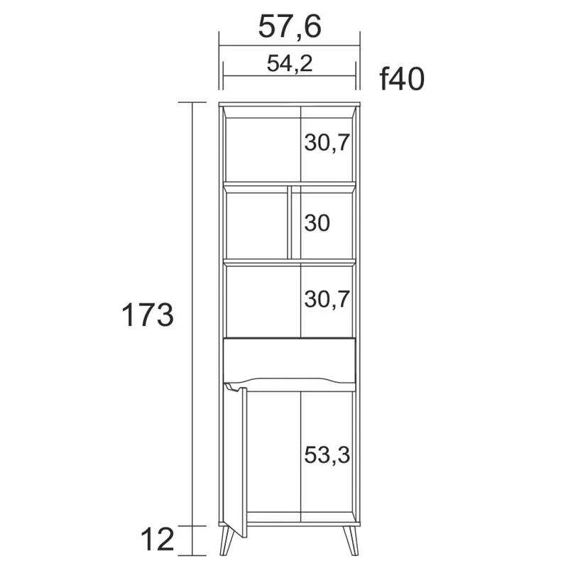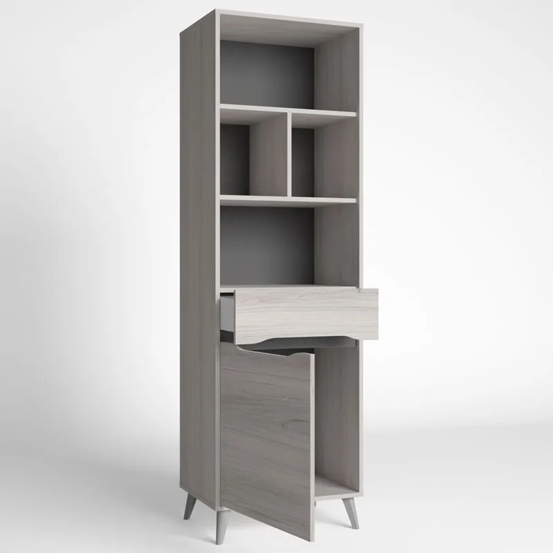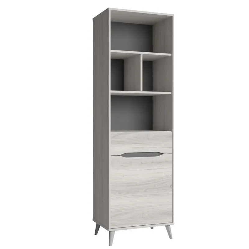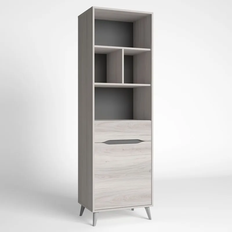 Espectacular mueble estantería para darle ese toque de distinción que estas buscando en tu salón, y puedes utilizarlo para almacenar tus libros favoritos, DVD, decorarlo con recuerdos o lo que prefieras. Esta estantería esta fabricada en melamina de alta calidad acabada en color shamal y pizarra. La parte superior se compone de 4 huecos amplios, y en la parte central dispone de un cajón y una puerta en la parte inferior. Sus patas son en ángulo lo que le da ese toque nórdico que tanto se lleva. Medidas: Alto 185 cm Ancho 57’6 cm Profundo 40 cm. Se trata de mobiliario con kit de montaje, que incluye manual de instrucciones y tornillería. LAS ENTREGAS SE REALIZAN A PIE DE CALLE