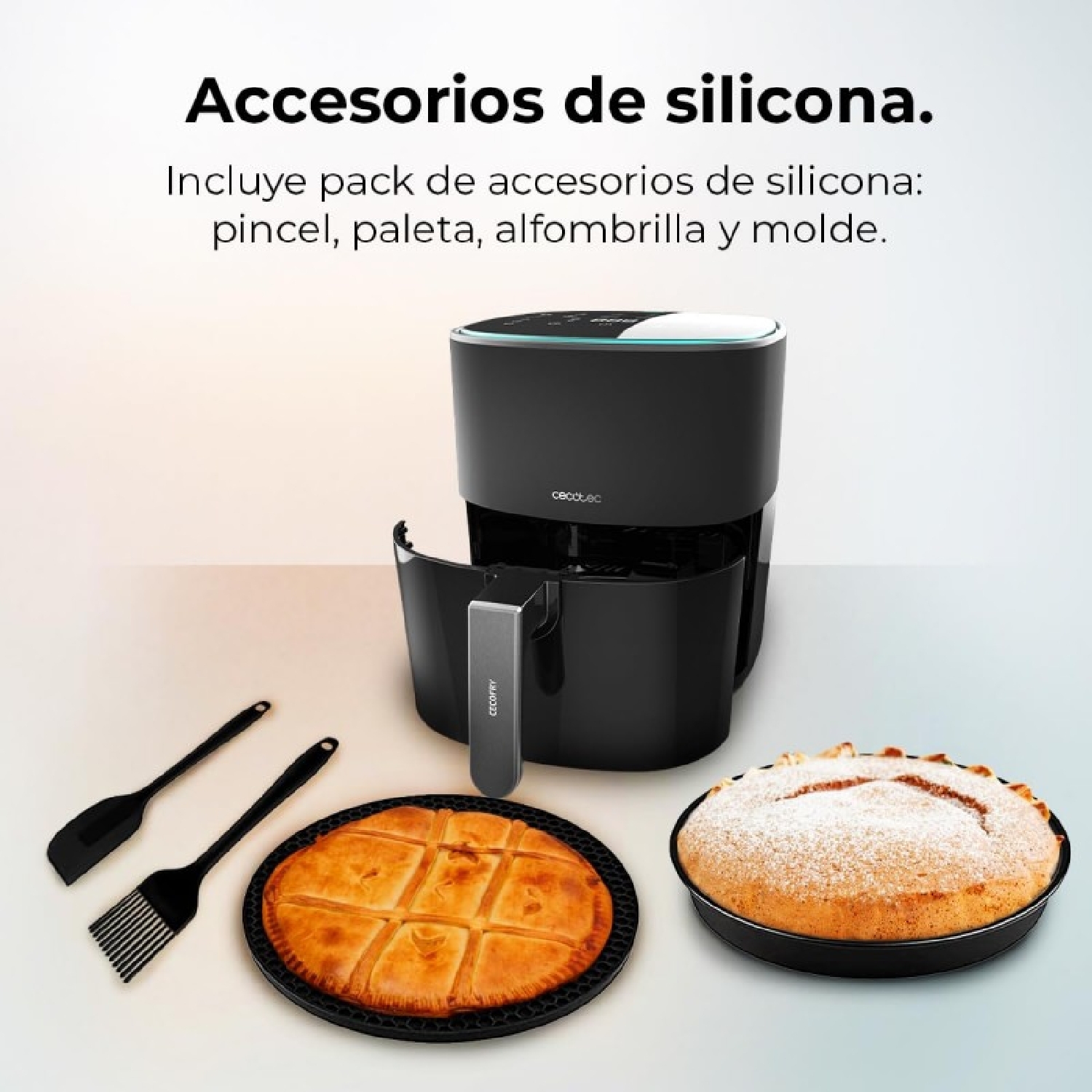 Incluye pack de accesorios de silicona para realizar un sinfín de recetas (pincel, paleta, alfombrilla y molde).