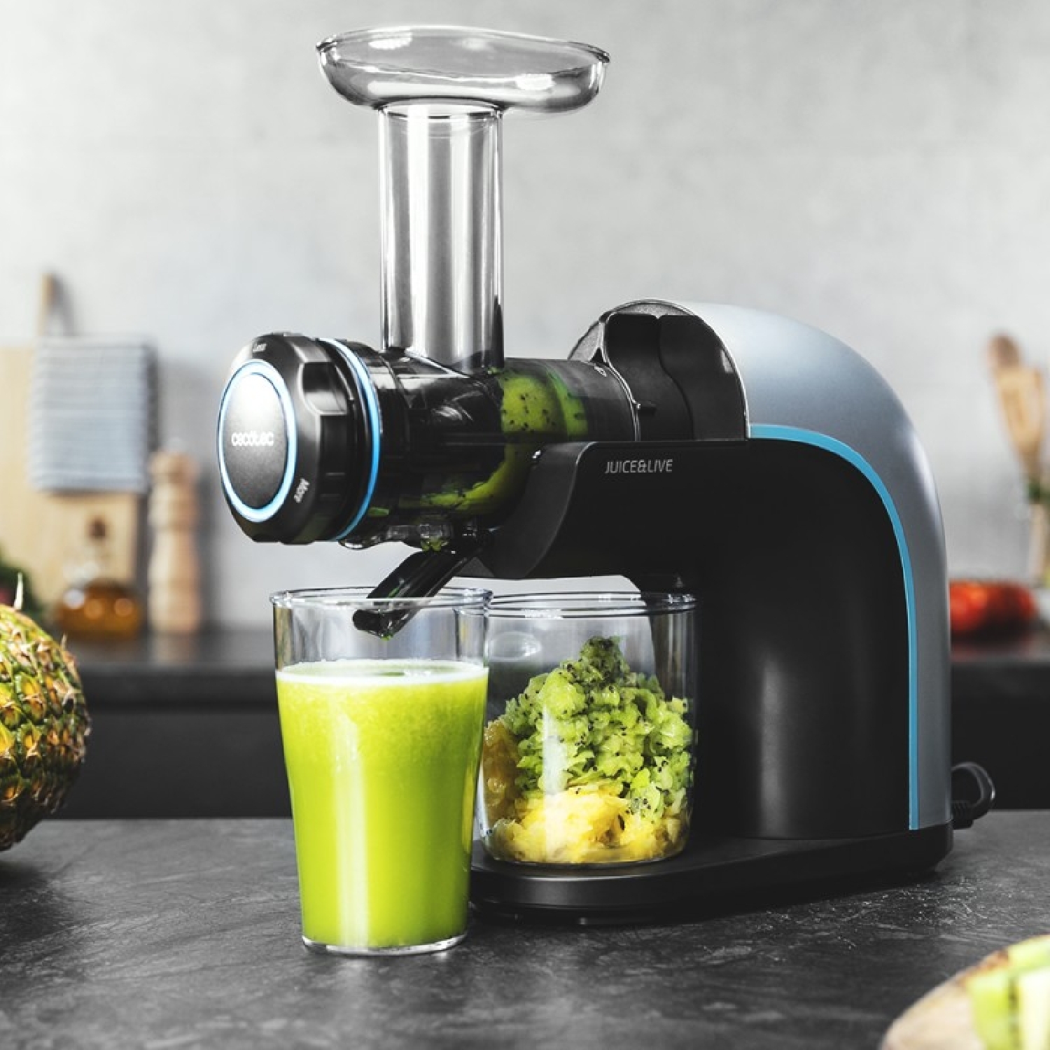 Licuadora con sistema de prensa fría que extrae más zumo a frutas y verduras, mantiene sus propiedades naturales y evita la oxidación.