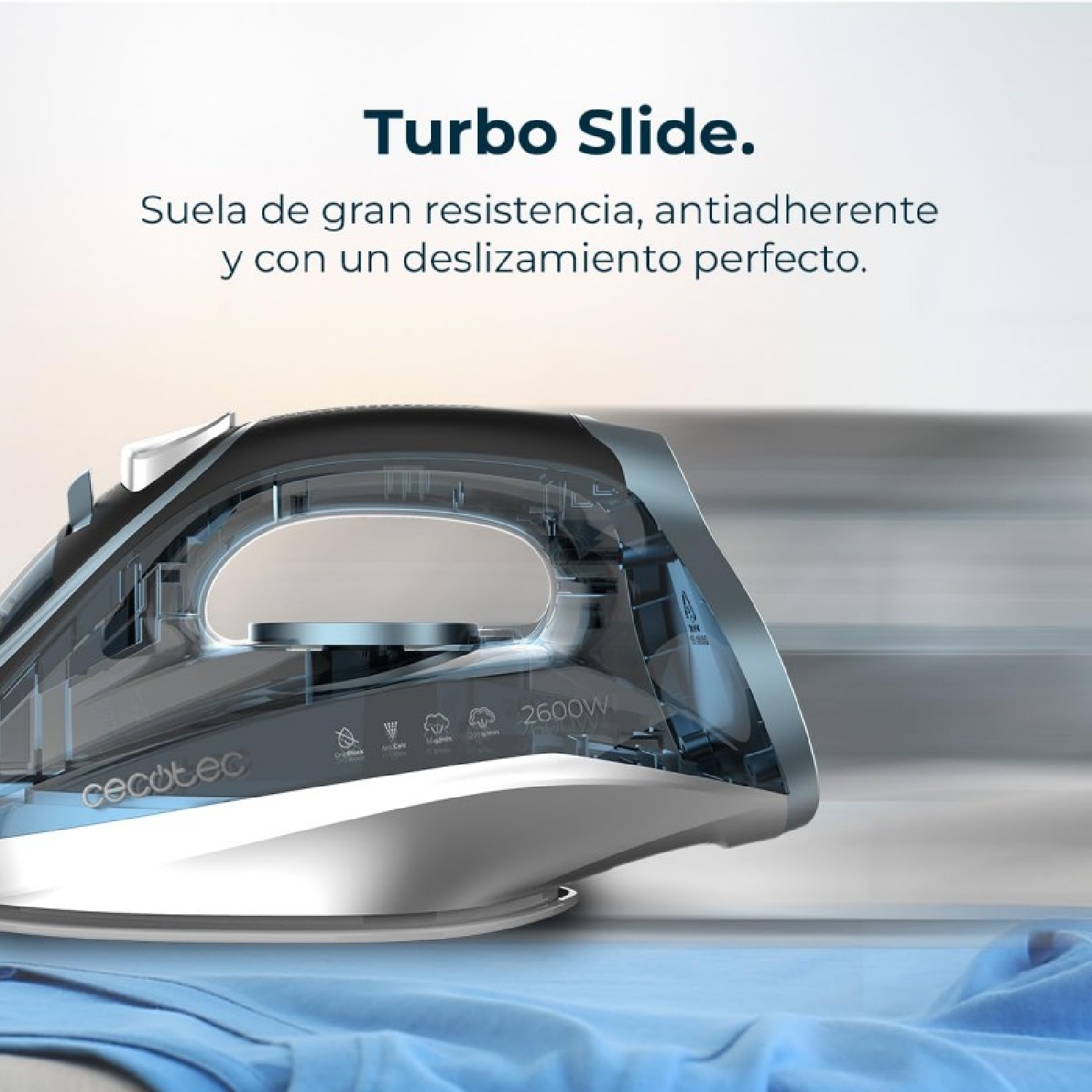Suela Turbo Slide de gran resistencia y antiadherencia con un deslizamiento perfecto. Innovadora tecnologÃa que facilita el desplazamiento sobre las prendas y permite un planchado más ágil y seguro.