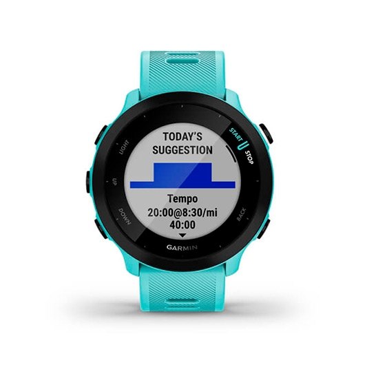 Este intuitivo reloj inteligente con GPS se ha diseñado para que todas las personas, sin importar su nivel de habilidad, puedan realizar un seguimiento de sus estadÃsticas y cumplan sus objetivos de ejercicio. Este reloj inteligente ligero y cómodo es perfecto para correr y para la vida diaria. Tanto si estás corriendo un 5K como si lo estás dando todo durante las sesiones de HIIT, disfruta de una comodidad increÃble con esta correa deportiva de silicona. Controla por dónde corres y obtén estadÃsticas precisas, incluyendo la distancia, el ritmo y los intervalos. Obtén datos de la frecuencia cardiaca y alertas si esta sigue alta mientras estás en reposo. Incluso mide la intensidad del esfuerzo del corazón durante actividades. Mientras estás de un lado para otro, Forerunner 55 hace un seguimiento de los pasos, los minutos de intensidad y mucho más. Comprueba si el dÃa está siendo tranquilo, equilibrado o estresante. Los recordatorios de relajación incluso te animarán a que realices una breve actividad de control de la respiración. Para conseguir unas indicaciones de entreno personalizadas, obtén recomendaciones de carrera diarias de diferentes intensidades, en función del historial de entreno, el nivel de forma fÃsica y el tiempo de recuperación.